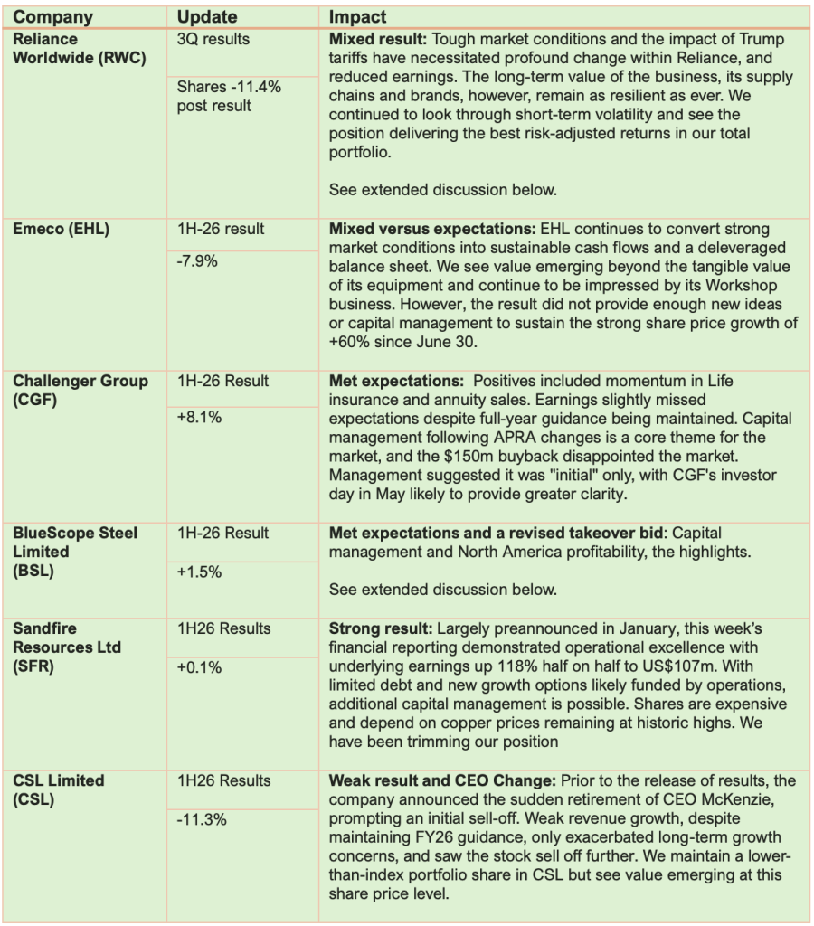 The market expected earnings weakness, yet a combination of extended tariff-related costs and weakness in specific product margins in Australia led to further downgrades of FY26 earnings expectations of 2-5%. The market responded aggressively, selling the stock by more than 10 per cent.