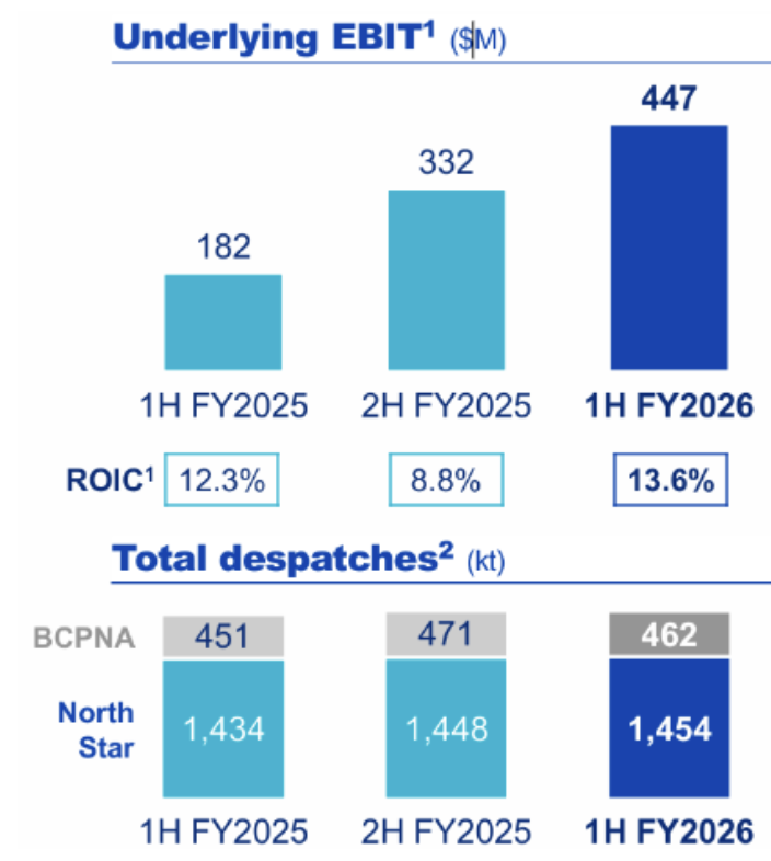 By segment, North America was the standout with underlying EBIT of $447m (up 35% vs 2H FY25), helped by North Star running at 100% utilisation, stronger realised spreads and a production record.