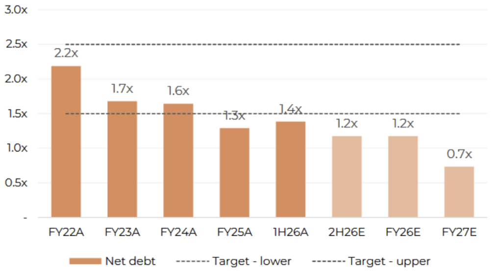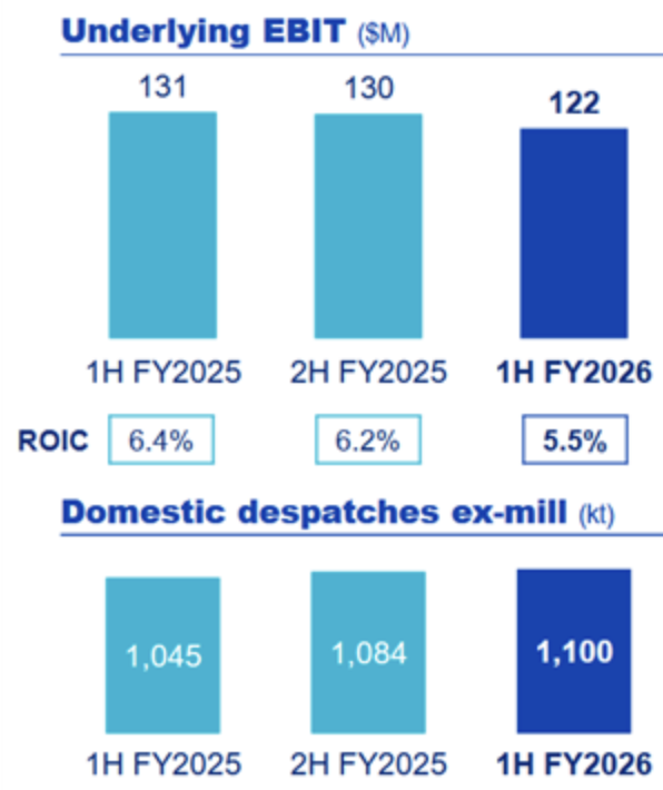 BlueScope’s 1H FY26 result was notably stronger, driven by the US business. Reported NPAT rose to $391m (up 118% vs 1H FY25) and underlying EBIT was $558m, reflecting stronger US steel spreads, higher volumes across key markets and solid cost performance despite “sustained low” Asian spreads. The improving conditions that have led to higher profits were expected by all and were core to the investment thesis.