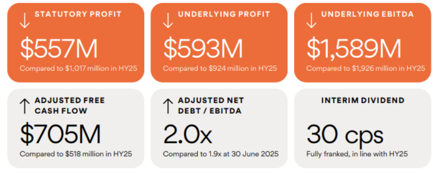 At the headline level, Origin delivered statutory profit of $557m and underlying profit of $593m, while holding the fully franked interim dividend at 30c per share. Dividend stability matters: it signals confidence that the uplift in electricity profitability is not a one-off and that the balance sheet can support both investment and shareholder returns through the next phase of the transition.