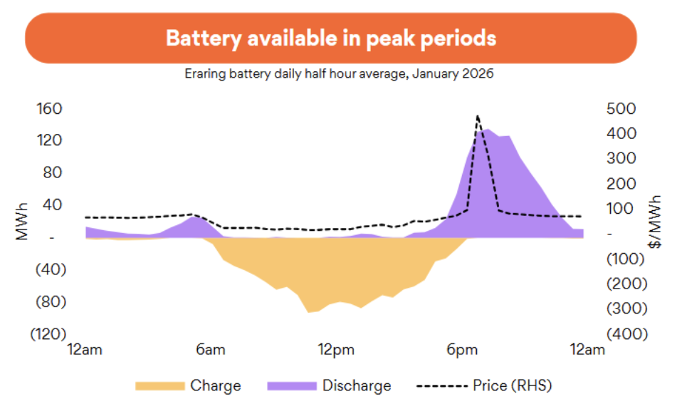 Our favourite chart of the reporting season so far is the following. It shows how Origin uses its battery capacity throughout the day. Yellow is the charging period, which corresponds to the low Prices (RHS). The purple area is when the batteries are discharging. These periods correspond to the evening peak price and usage periods. The price difference between the two periods is pure gross profit. Charge when electricity is cheap, discharge that is provide to the grid when it is expensive.