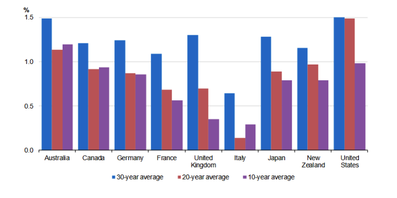 But productivity needs to rise and institutions need to be strong. The chart below from the Australian Treasury in 2023 shows that indeed Japan in the decade to 2021 had similar productivity growth to New Zealand despite vast differences in population dynamics.