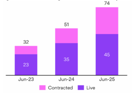Kraken’s enterprise software platform has a strong track record of large, fast customer migrations, which are critical for deployment and growth. This success is evident in the dramatic growth of Kraken’s global customer base, as shown in the figure below. “Contracted” refers to the size of potential customers who have signed up for the Kraken product, and “Live” refers to accounts that are fully migrated.