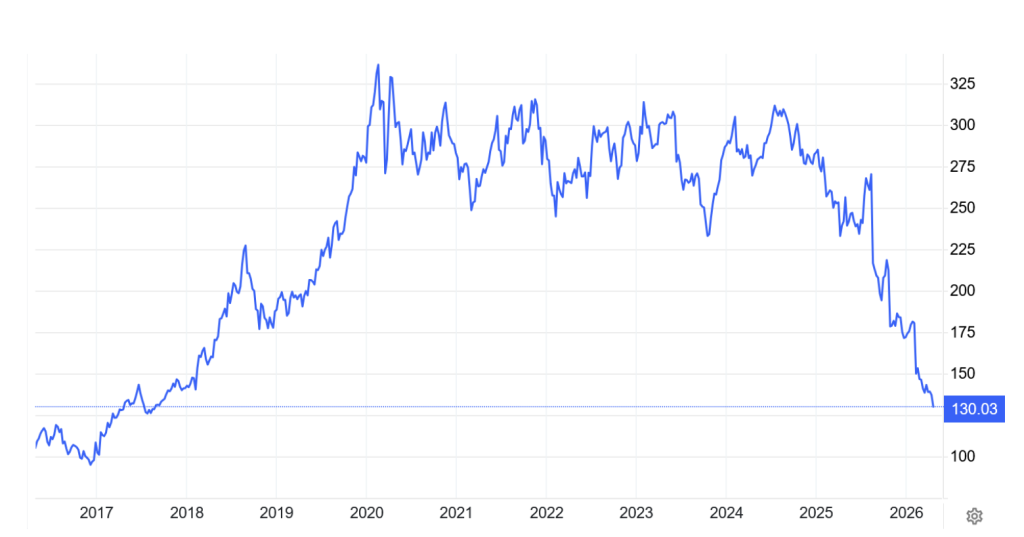 The share-price fall — from a peak above A$300 to around A$130 today — reflects four compounding factors, not a single event.