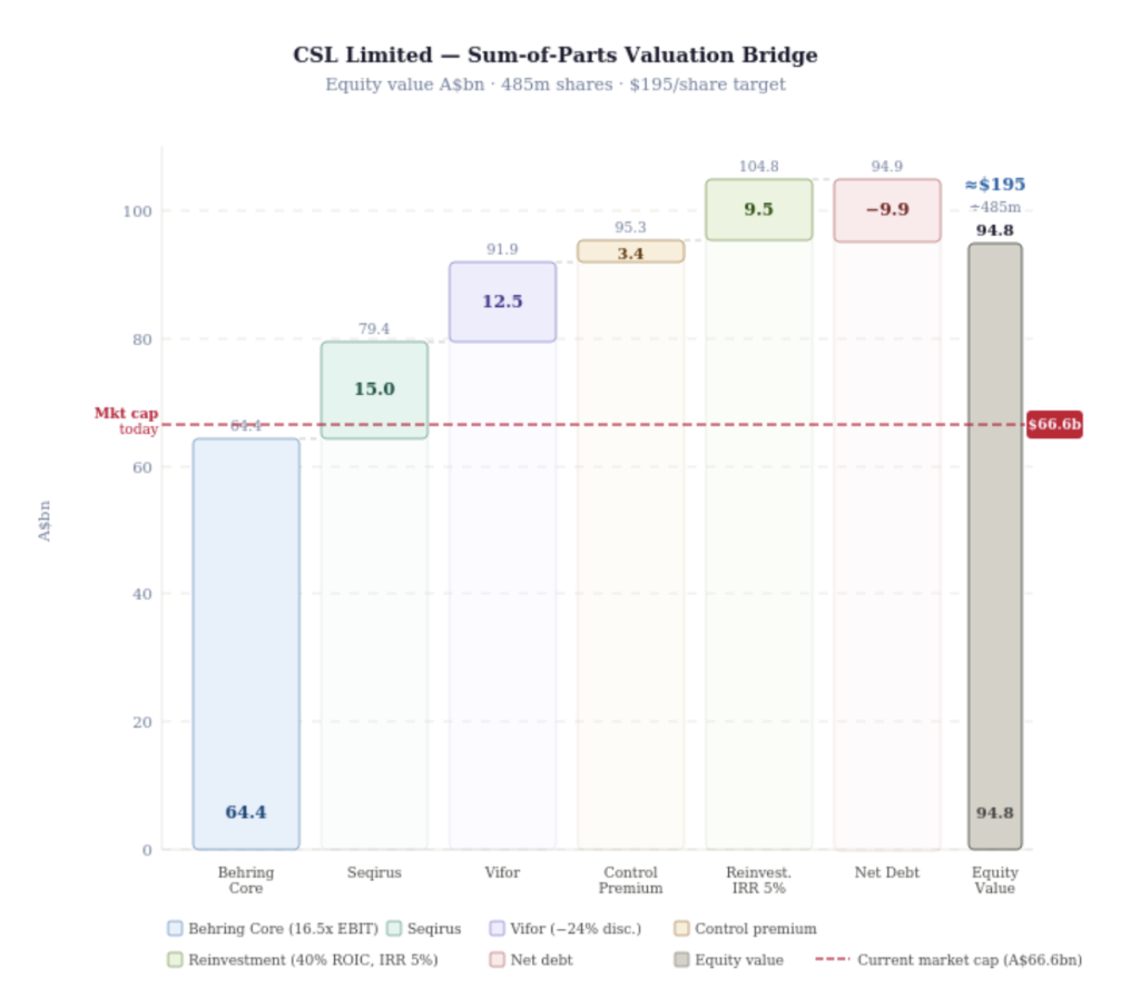 Figure 2: Sum-of-parts valuation bridge – CSL Limited. Equity value A$bn. Source: internal analysis.