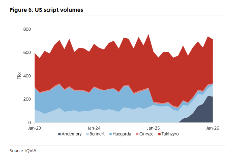 There are genuine bright spots. Andembry, the anti-FXIIa HAE product garadacimab, received approvals across six major markets in FY25 and uptake has accelerated (see figure #6, below). Building on wins like this could support a re-rating over time.