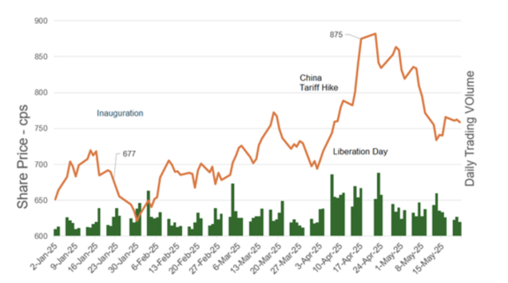The value of Lynas’s non-Chinese supply chain came to the fore. The figure below shows the higher prices and increased market volumes traded in Lynas following the Trump tariff announcements. In response to a pause and reduction in US tariffs on China, the Lynas share price fell again.