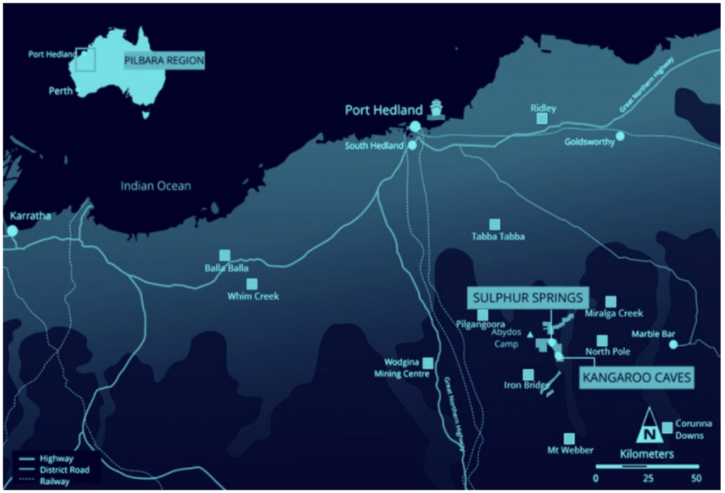 As shown in the figure below, the Sulphur Springs project is located 144 km to the southeast of Port Hedland and includes the Sulphur Springs and Kangaroo Caves deposits together with other tenements. The targets have returned intersections of commercial-grade copper and zinc in previous feasibility studies in 2023.