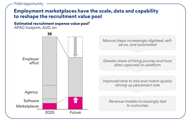 One of the diagrams presented on strategy day that we appreciated provided the Seek vision for the future of recruitment expenses. This view is likely to be very important if the benefits of AI can be harnessed at the enterprise level.