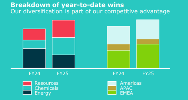 Regarding short-term earnings, there remains uncertainty regarding oil prices in a tariff-uneasy world. Still, there had been no material project cancellations or deferrals since the last update in February. The chart below shows the company being ahead regarding project wins in FY25 (TYD March) versus the previous year. The breadth of improvement across chemicals and resources is especially pleasing, given the upside potential in Energy in the medium term.