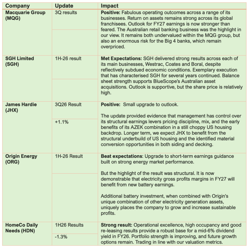 We thought the 3Q update was excellent. Note that Macquarie Group is a significant position in client portfolios, and along with Judo Bank, represents a significant divergence from the index in terms of the types of banking exposure we prefer. The MQG group’s diverse features were on display.