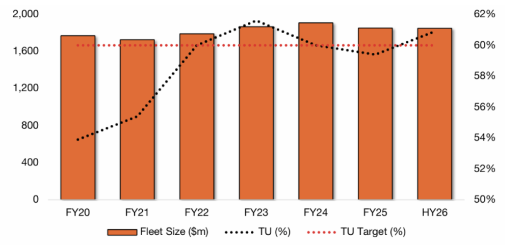 The chart below shows Coates’s evolution into a company with a high and sustainable return on invested capital (ROCE) of 13.0%. On average, for the past four years, the company has achieved time utilisation rates above target (60%) without needing to increase the amount invested in the fleet ($m, LHS)