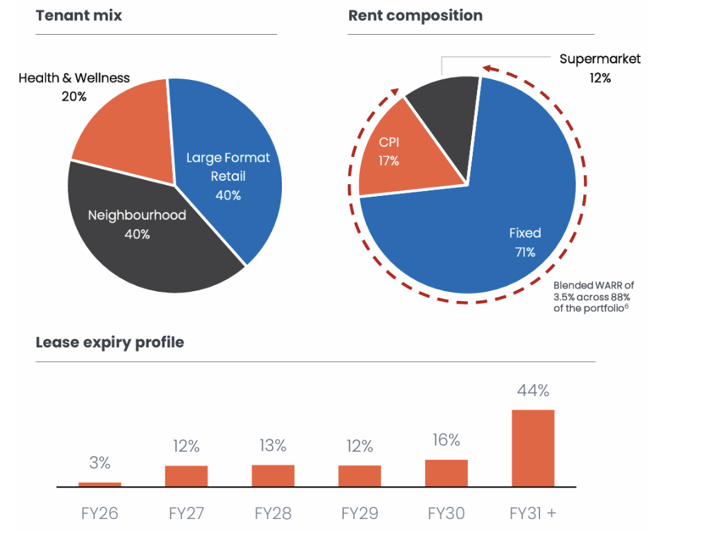 The figure below shows the tenant mix, which relies on large-format, neighbourhood, and health businesses. Future rent growth is largely fixed, and almost 50% of tenants are in place till post 2030.