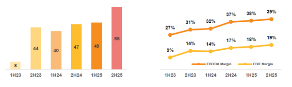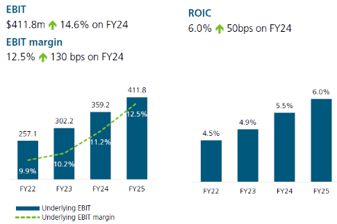 - Operating EBITDA climbed 7% to $301m, with margins expanding to 38% in FY25 and even higher in the second half.