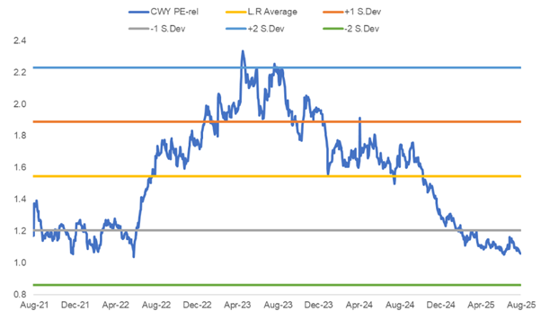 As clients and regular readers would be aware, we always maintain one eye on the underlying value and another on the price we pay for a company’s stock. Figure 4 below shows the relative price paid for CWY as compared to the entire market.