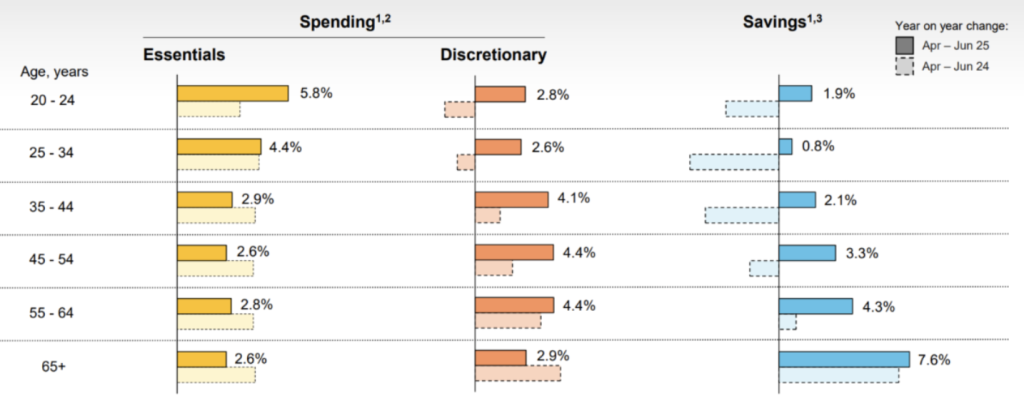 - Essentials spend rose across all ages but was strongest for the young: about +5.8% (20–24) and +4.4% (25–34), then moderating to ~2.6–2.9% for ages 35+—consistent with easing goods inflation for older cohorts but ongoing price pressure on younger households’ must-haves (rent, transport, groceries). The cost-of-living impacts are strongest amongst the young households.