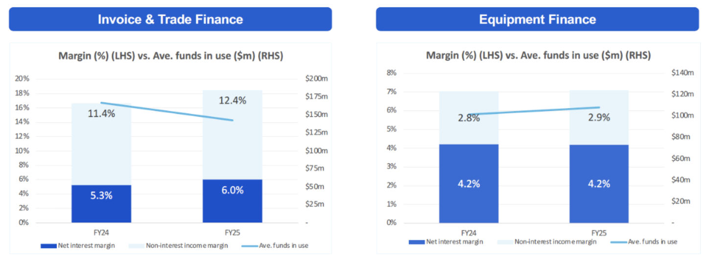 The following figures illustrate how the margins in Invoice/Trade finance increased in FY25, despite the average funds in use falling. Equipment finance grew margins and volume, but it is arguably of lower quality, especially if the business is growing in other areas.