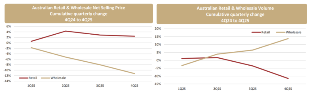 The figures 5 below show what happened. The wholesale poultry net selling price (NSP) fell significantly, down approximately 10% year-over-year, reflecting acute pricing pressure in this channel. At the same time, the amount of chicken that Inghams was required to sell in this channel continued to grow.