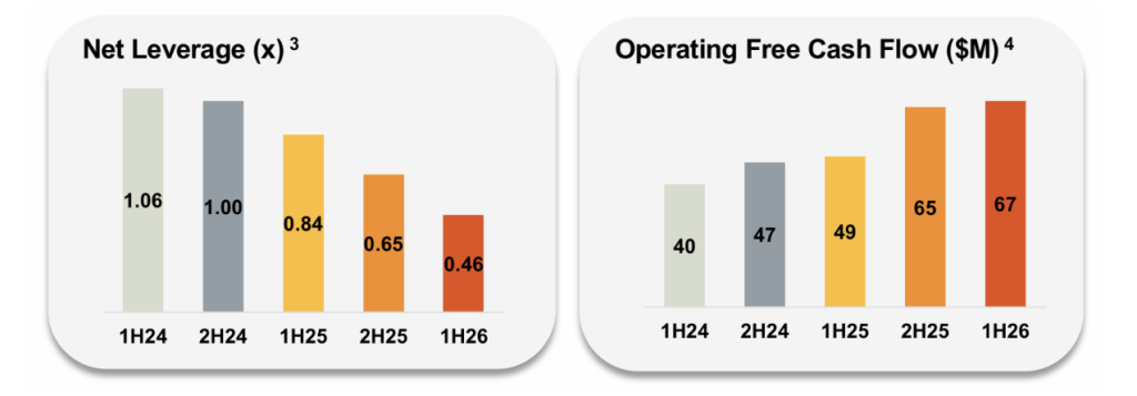 Emeco’s 1H26 result stood out for one simple reason: cash. Net cash generated by operating activities lifted 22% (+$26m) to $145m, reflecting stronger operating performance and continued discipline in working capital. On Emeco’s preferred measure, after maintenance capex, operating cash flow was $67m (up 37% on 1H25), highlighting that earnings are being translated into liquidity rather than trapped on the balance sheet as plant and equipment value.