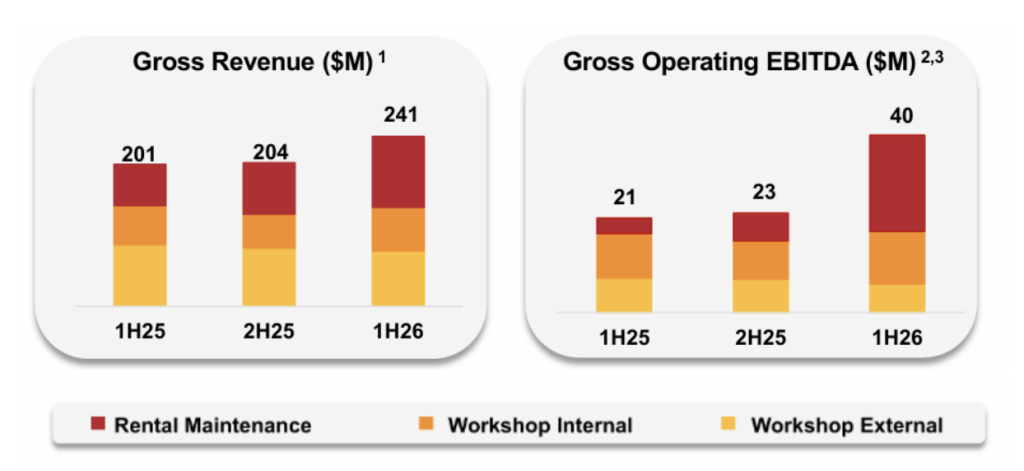 Operationally, the more interesting signal was the mix shift toward maintenance and away from pure rental. Group revenue rose 9% to $420.8m, and Operating EBITDA increased to $155.5m, with the uplift largely driven by higher earnings from maintenance services. Higher maintenance intensity typically reflects customers prioritising “sweat-the-asset” uptime, which is positive for utilisation and earnings stability. It also tends to be stickier than purely growth capex-driven demand, smoothing the cycle.