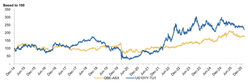 In addition, insurance company returns are positively correlated with higher interest rates. The chart below shows how QBE’s share price has responded to global interest rates (US 10yr bonds). We would argue there is further room to move higher.