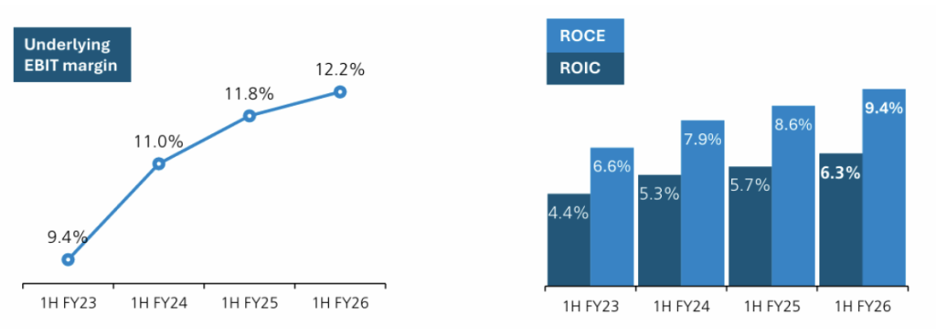 The figure below clearly shows the multi-year build in EBIT margins, Return on Capital Employed (ROCE), and Return on Invested Capital (ROIC). The improvement need not stop at current levels, with return on capital measures arguably still needing to lift as productivity and systems efficiency continue to improve.