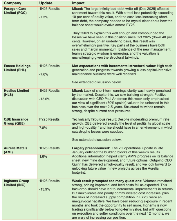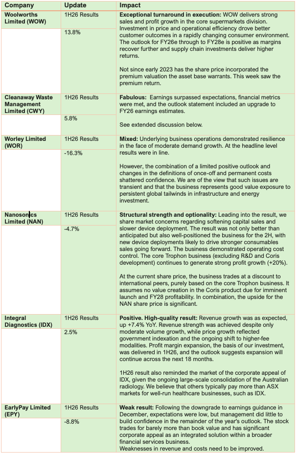 High-quality results this week from large companies such as Woolworths and Cleanaway were offset by weak results from Qantas and ongoing volatility in the software space.