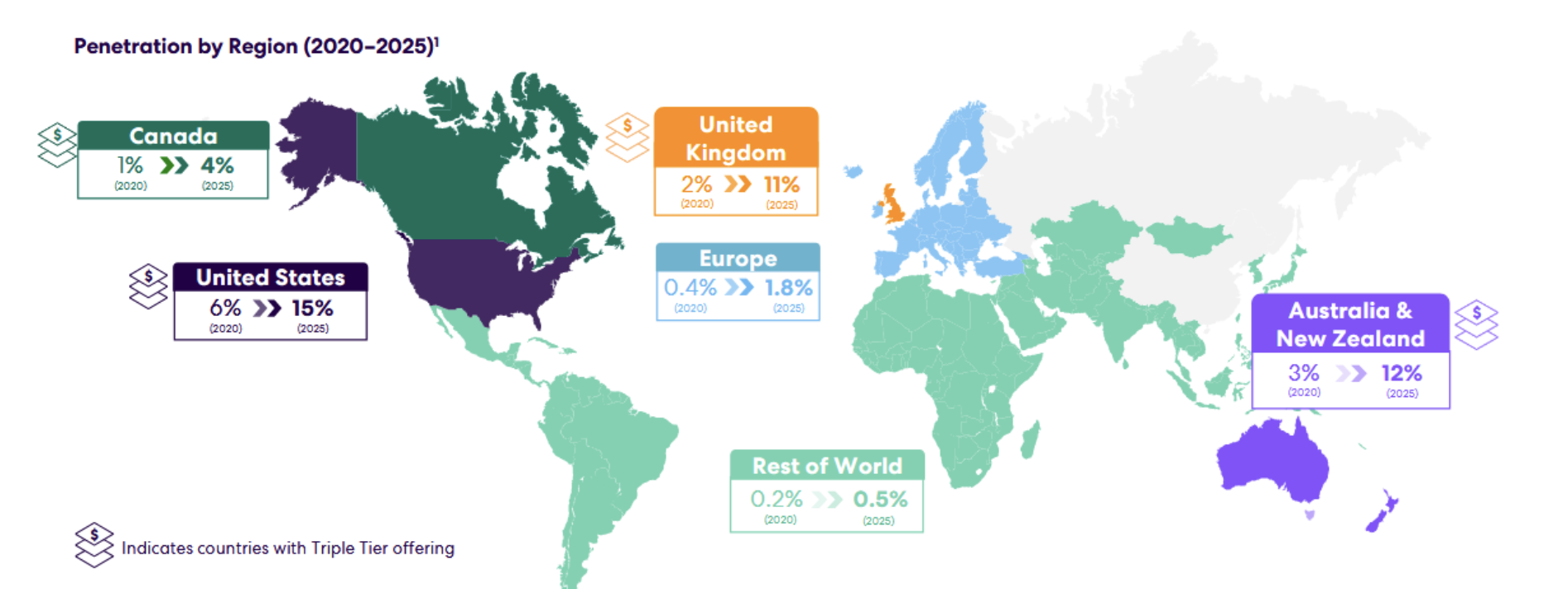 The breadth of app usage across the globe (Figure below) and the strength of its growth since 2020 are indicative of high levels of social change underpinning its usage. The 12 per cent usage in Australia refers to the percentage of the smartphone-enabled population that are Life360 members, a number which has grown from 3 per cent in 2020. With such a large number of users, there are exciting possibilities for the company to explore various monetisation options, which include but aren’t limited to Paying Circles. Its ambition for paying users is to evolve into a “super‑app” for families, encompassing safety, connection and other services. As Life360 has already achieved profitability with a smaller fraction of paying users, 2.5 million paying out of 88 million users, the runway for profit growth remains significant.