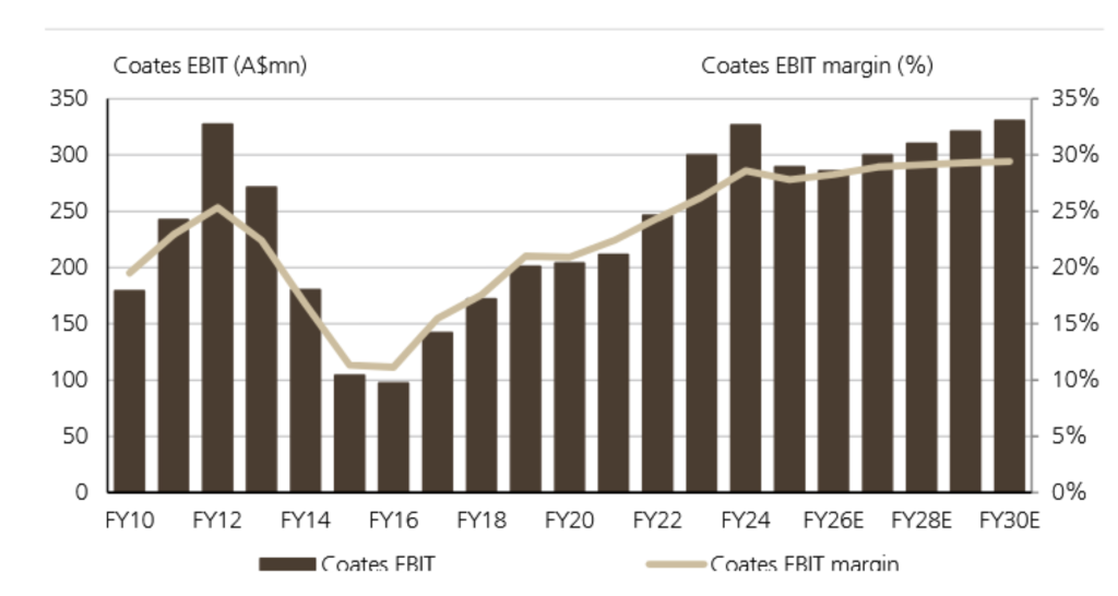 The stumble this year in Coates Hire earnings is shown in the Figure below (note the fall in EBIT between FY24 and FY25). The scale of improvement achieved in the past decade has been impressive, with significant improvements in operating activities and capital management driving the result. UBS estimates shown for FY26 through FY30 highlight ongoing growth expectations that are broadly consistent with our modelling, although we expect limited improvement in FY26. The facts in our mind point to Coates currently generating adequate returns on capital, and hence future growth from here is dependent on the strength of the Australian economy and construction.