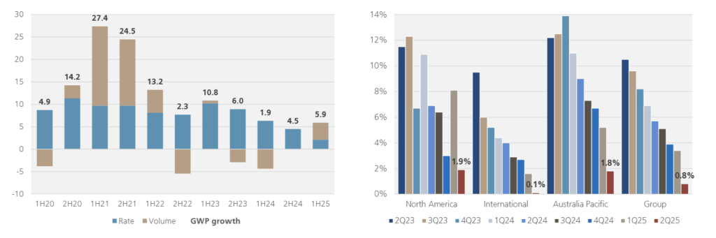 QBE: Growth in premiums by half since 2020 (GWP, LHS) and average premium inflation year on year since 2023 by quarter (RHS)