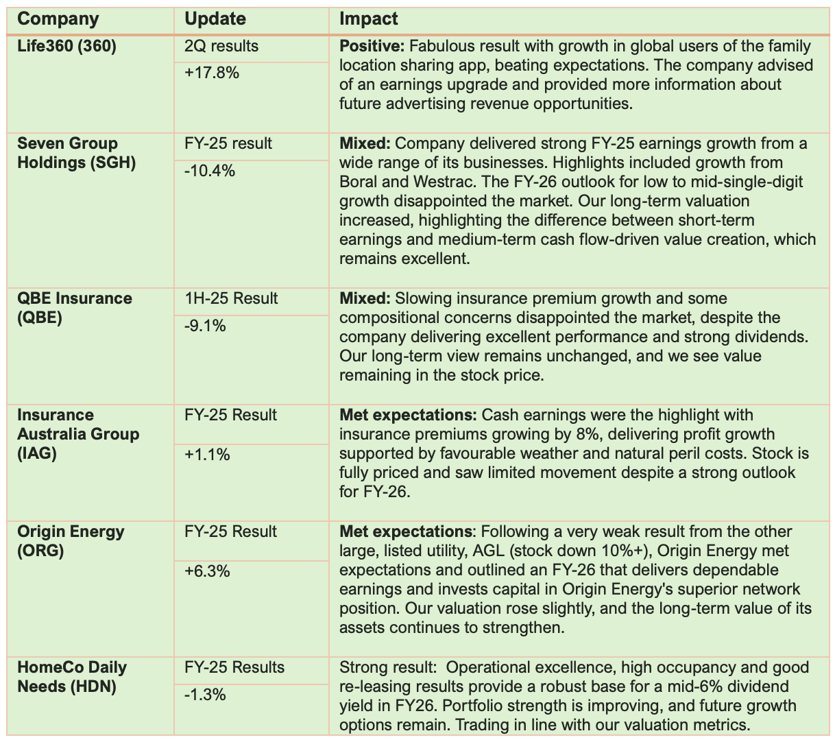 In the remainder of the document, we will provide more details on the larger portfolios’ positions and results of significance for our long-term valuations. When companies such as Origin Energy, which report late in the week, the longer description of the results will be retained for the following week. Occasionally, commentary on small positions in smaller companies will be retained until post-reporting season in September.