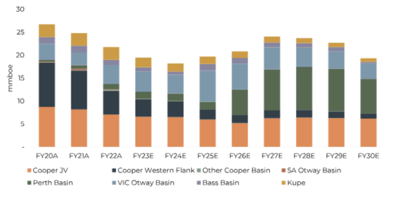 The chart below shows future production, and what is clear is that the Waitsia (Perth Basin) volume is key to generating consistently growing output in the medium term.