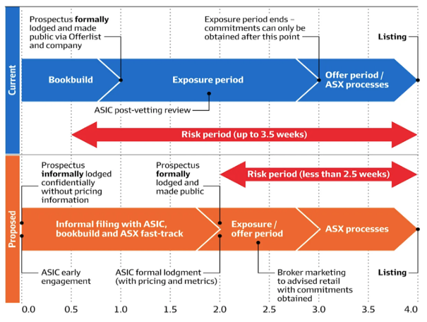 In its initial response released on June 10, “ASIC clears path to faster IPOs” the regulator has signalled it will informally review IPO documents under a new fast-track process two weeks before formal lodgement, reducing the timetable for the company to reach the ASX by a week. This is designed to prevent re-work of pre-IPO documentation as well as reduce the time to market, reducing the prospects for market volatility at the time of a proposed IPO to impact investor sentiment and consequently company valuations.