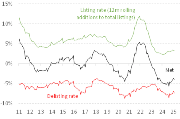 The net impact of fewer new listings combined with companies exiting the market (due to takeover, company failure or simply a decision not to continue remain publicly owned) is referred to as de-equitisation.