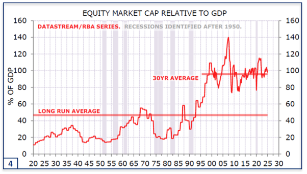 Perhaps more concerning for index investors is the fact that the size of the share market compared to GDP has been relatively constant in the past 30 years.