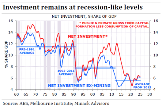 And this is where we can tie up the themes. Australia has stopped investing at rates consistent with growing our economic capacity (see below), and hence the need for ASX listing fell alongside it.