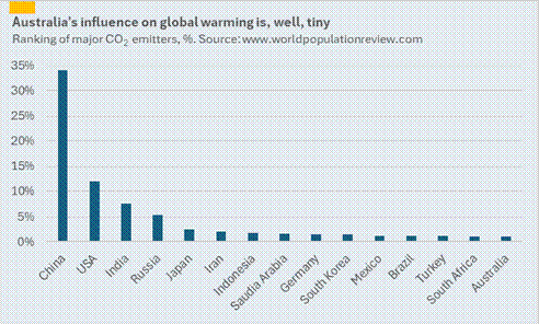 It may be a heresy to write this, but there’s little Australia can effectively do other than appear virtuous. Y’see, Australia is ranked 17th for global CO2 emissions. Whatever Australians do is not going to much move the global needle. But, make no mistake, the government will spend billions of we-the-taxpayers dosh trying to.