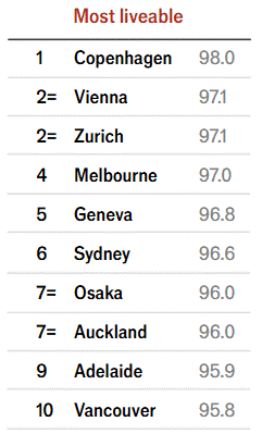 The venerable Economist magazine has just released its latest index of the world’s most liveable cities. And in spite of Melbourne’s soaring crime rate, the gateway to the south pole finds itself in fourth place.