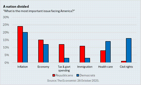 Readers probably guessed as much. But the detail shows how divided is the nation. When asked “What is the most important issue facing America?” there was bifurcation.