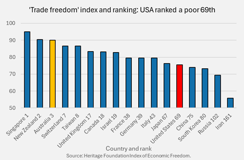 As the below chart shows, the US is ranked 69th globally on a measure of ‘trade freedom’. Australia, although not without sin, is pleasingly ranked. But would be wise not to cast the first retaliatory stone.