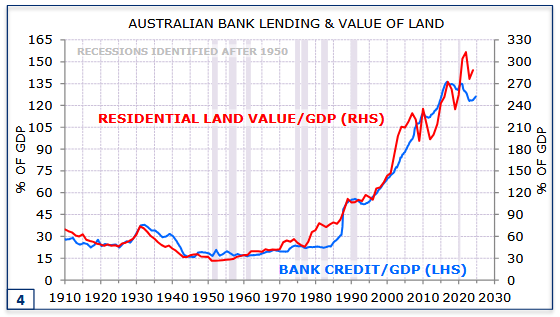 At sufficiently high levels of wealth and debt, an economy becomes a slave to both, especially in an economy like Australia, where our predominant source of wealth is an historical endowment of space and resources, with the remainder being real estate. The correlation between the explosion of Bank Credit leverage and land prices is clear.