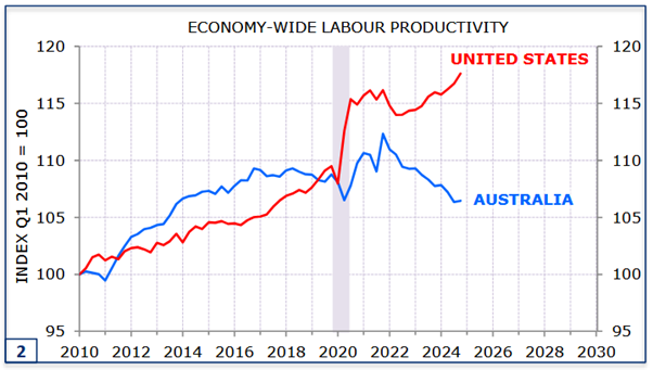 The haunting gaps in productivity between the US and Australia since 2010 have now become vast. Some of this is explained by the industry mix, including the NDIS, and lagged changes in mining investment, but all are long-run choices in our view. Ones that have led to weak overall outcomes, at a time when higher leverage and global demand provided alternatives.