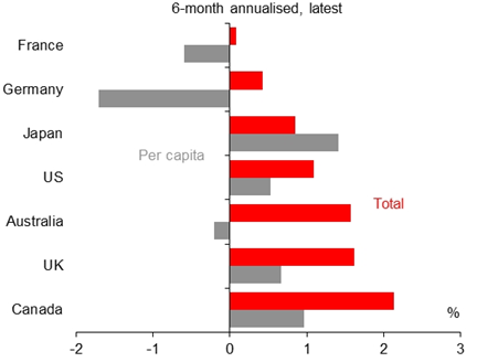Low economic growth is a recurring phenomenon worldwide, which is one reason why the implications of our low growth are muted at this stage. The figure below shows Real GDP on a 6-month annualised basis across a range of countries. Note, however, that our per capita outcomes (grey bars in the chart) are not comparable in the UK, Canada, Japan or the US.